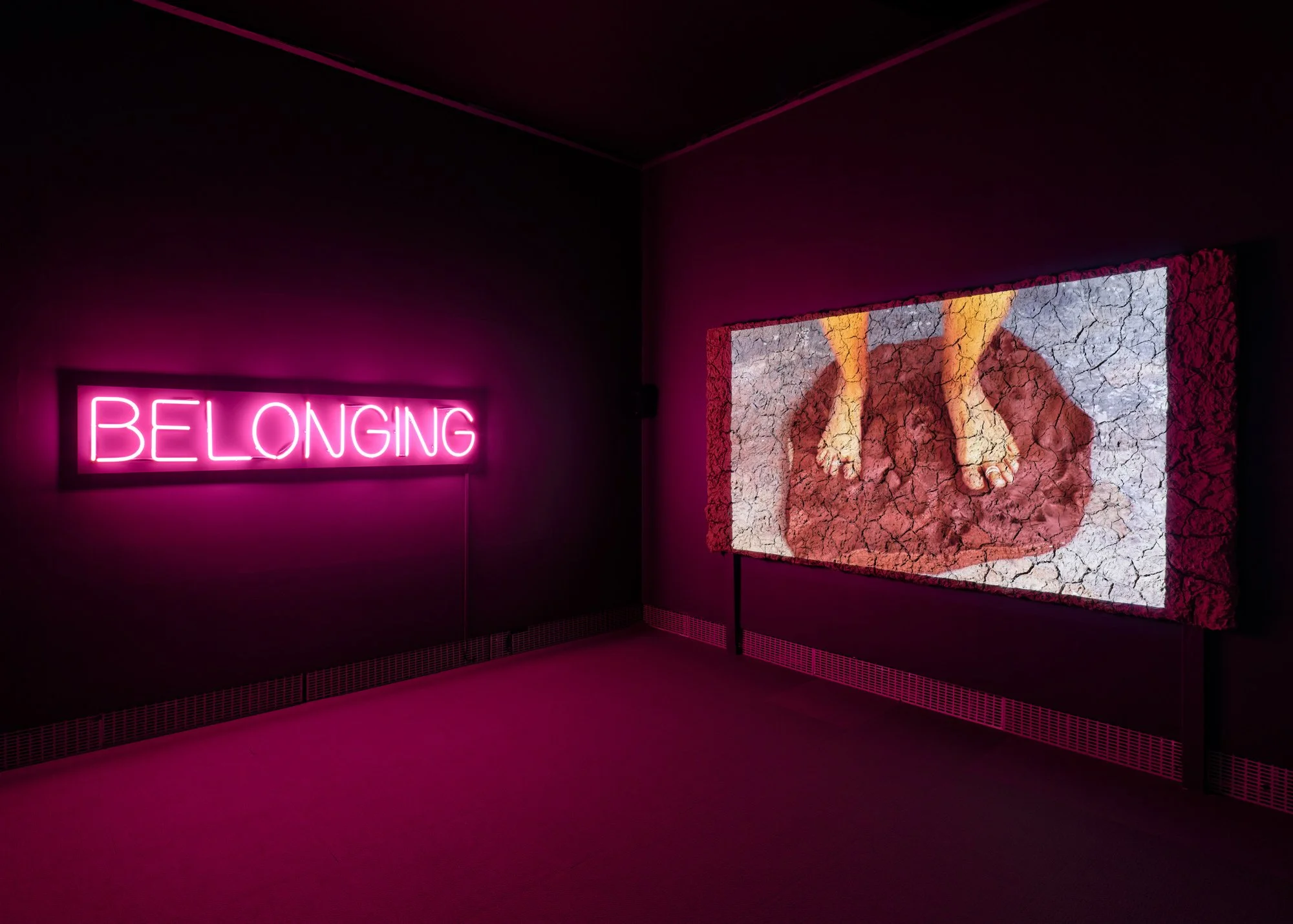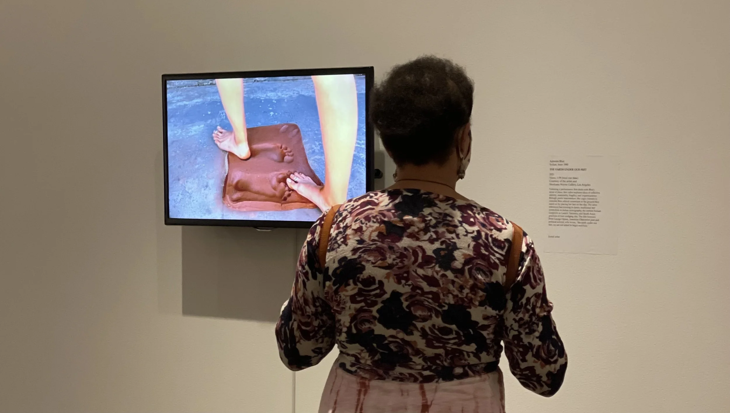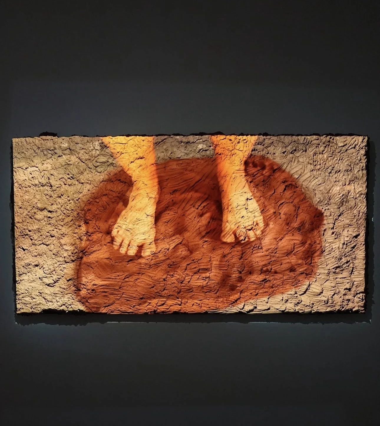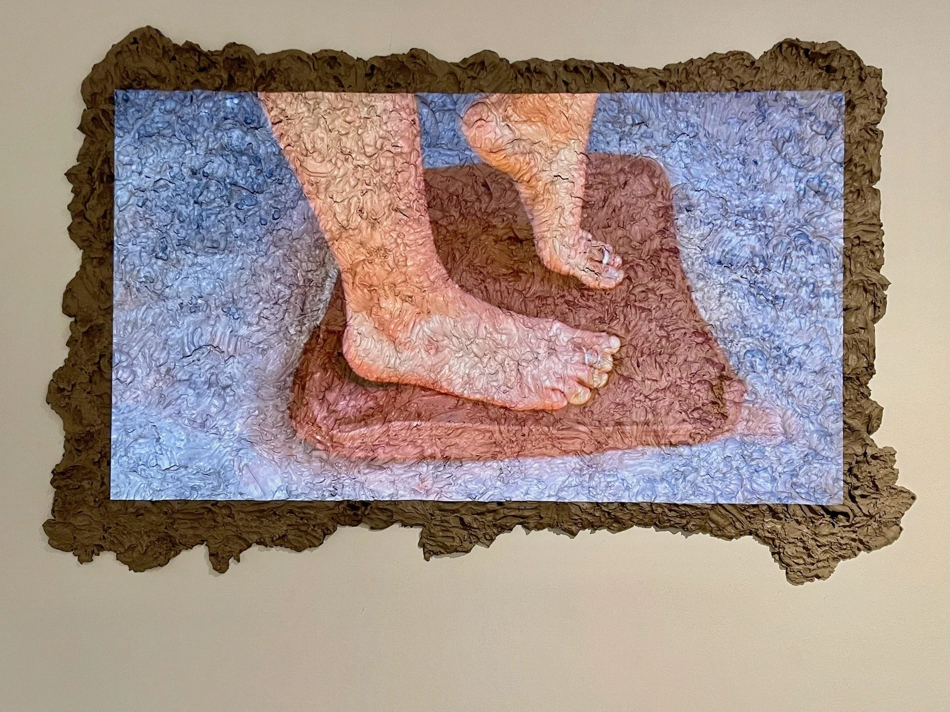 “Earth Under Our Feet,” by Ashwini Bhat, is a video installation in response to questions of belonging. It is reflective of the artist’s own journey and her search for a personal sense of place, a home. Her performance video is a poetic intervention exploring questions of collective identities, materiality, fragility, and impermanence. By projecting the video on a raw clay surface and by juxtaposing her own brown body with the brown clay body, she urges the viewers to notice our entangled and ethical connection to the ground we stand on. The autobiographical text is intended to be a mantra, a prayer, a meditation on belonging as a spiritual quest. The process is inspired by South Asian practices of foot-wedging clay. The title is from the notebooks of George Oppen, an American Objectivist poet, who wrote, “The earth under our feet; we are not asked to begin nowhere.”