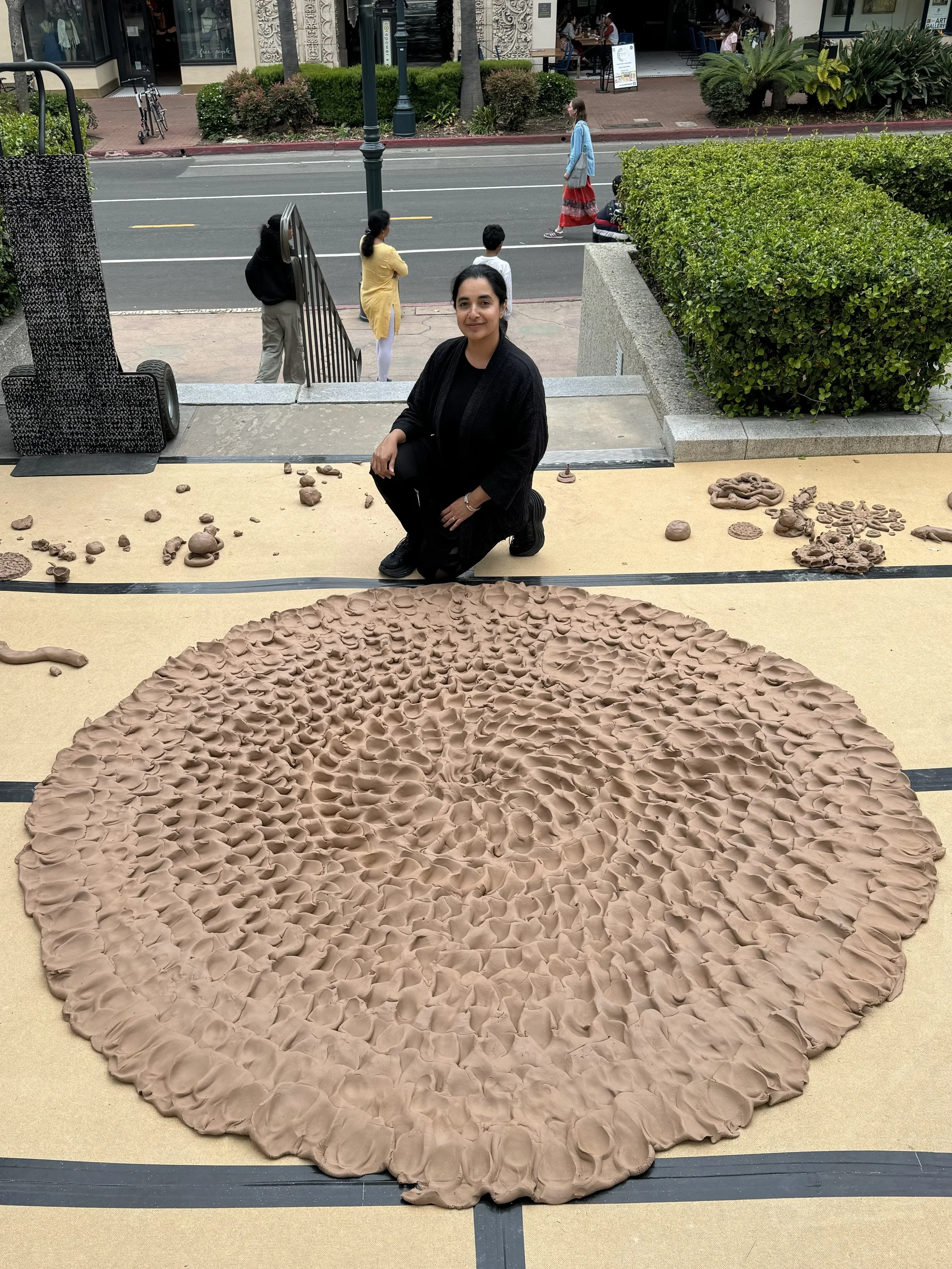 “Earth Under Our Feet,” performance is inspired by the symbol of mandala and by the concept of impermanence. During the performance, Bhat created an ephemeral installation of unfired clay that models our connectedness as it was shaped by audience participation. Through immersion and movement, this project invited participants to notice our entangled relation with others and with the very ground we stand on.