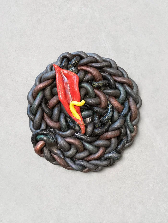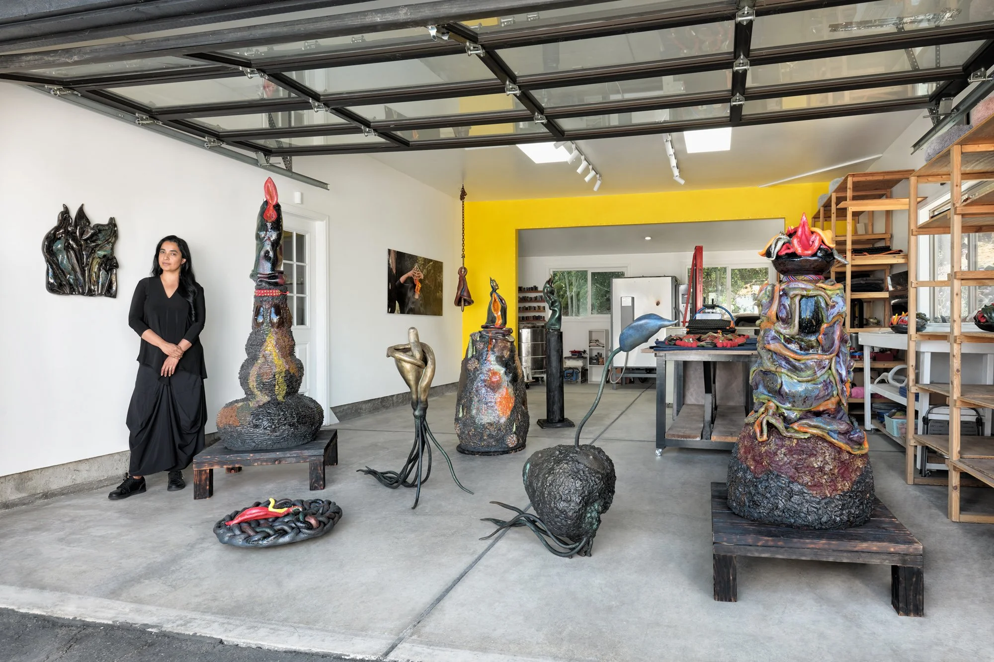 The calla lily emerges as a central motif throughout the exhibition. Though non-native, the plant thrives on Bhat’s land, dying back in the fall only to return each spring. “Dormancy,” she writes, “is not absence. It is self-containment. A sovereignty.” Her sculptures trace the calla’s life cycle—bud, bloom, burst, as metaphors for sensuality, decay, and regeneration. Many rise from wildfire, using scorched earth as their origin. Others recall artistic and spiritual lineages, from Georgia O’Keeffe to the 12th-century mystic Akka Mahadevi, who walked naked into the forest to find the sacred in trees. “These are portraits of my body, but also the land’s. Of women, mythic and real. Of my mother, who tucks a flower into her hair each morning.”