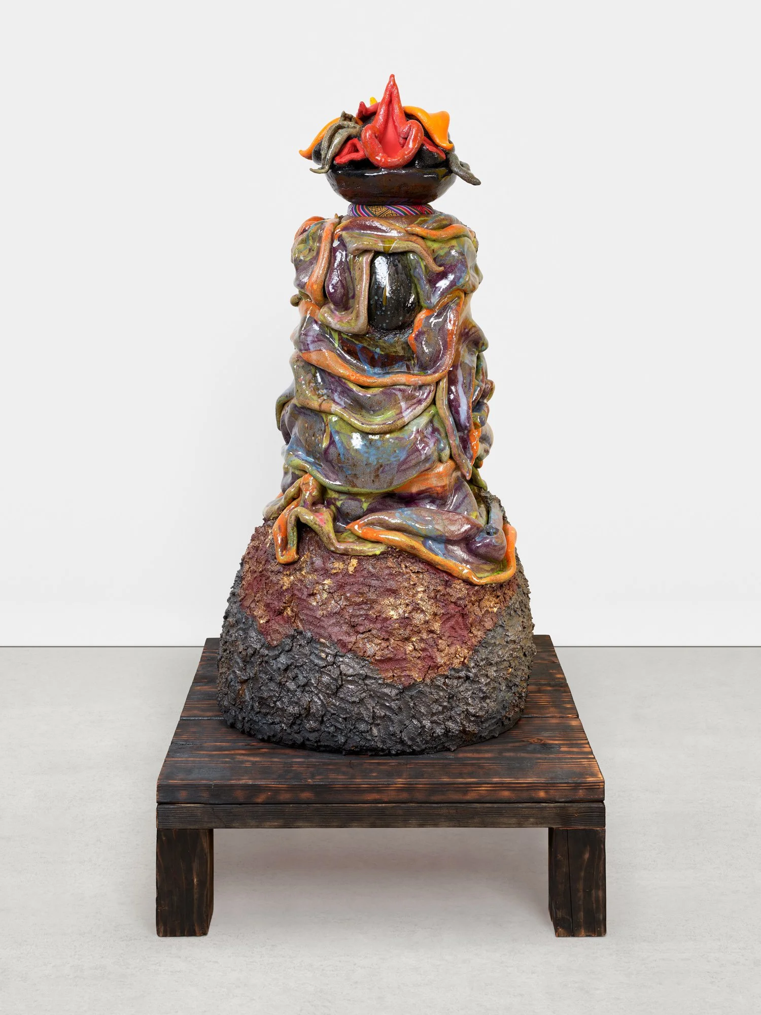 Self Portrait, Bloom, Glazed ceramic on a cushion hand-crafted in Nepal, on a scorched wooden base, 60 / 30 / 30 inches